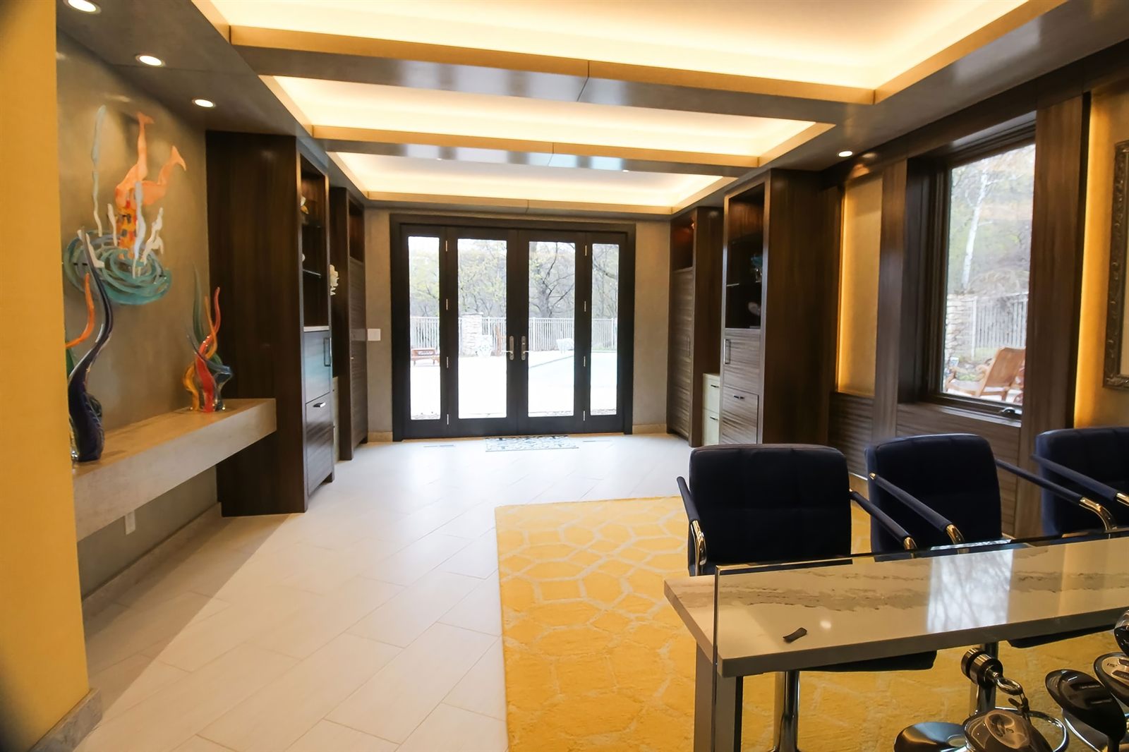 This custom lower-level project was designed as a complete wellness and entertainment retreat. The space includes a full gym, yoga studio, private movie theater, sunken golf simulator, and a welcoming transition area with heated floors and refined tilework. The result is a year-round extension of the home's lifestyle.